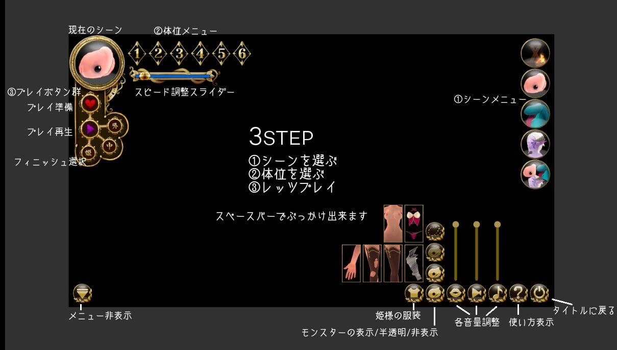 姫騎士であるヒロインが凌辱される画面メニューには、
