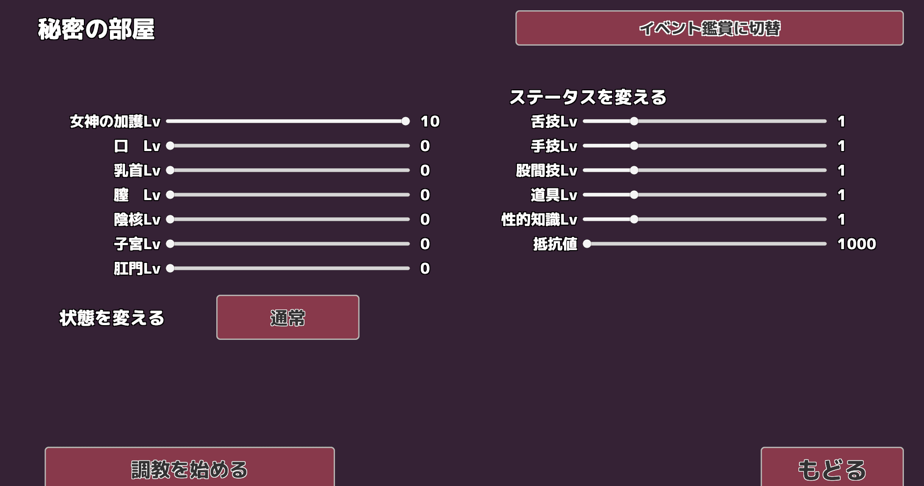 | ①女神の加護 | Lvを下げる事がゲーム目標 行える調教の種類が増えて、より良いエンディングに移行できる |