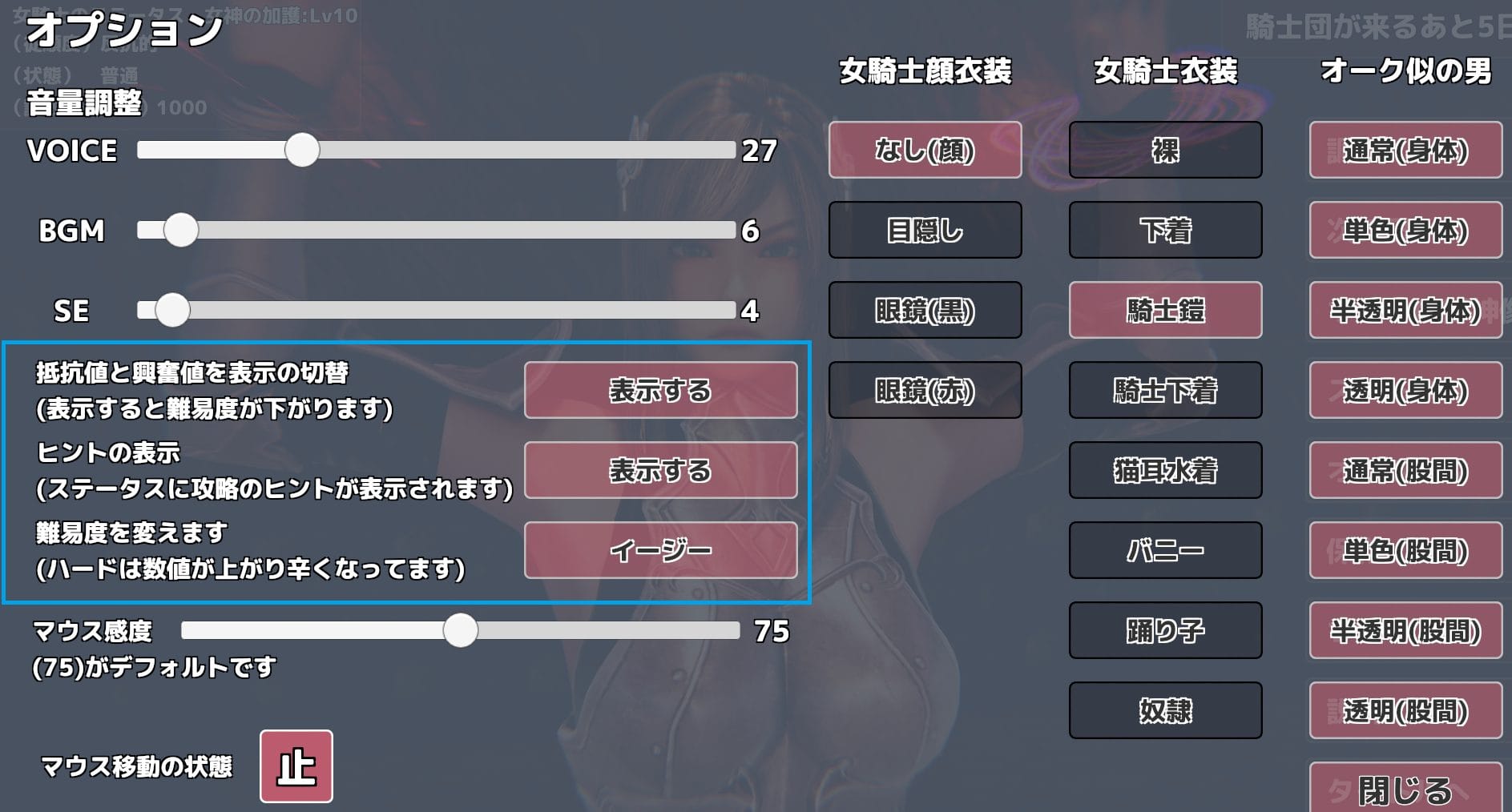 | ③状態 | 女騎士の状態で ”通常、催眠、催淫” の3種類ある 顔描写やセリフ演出などが変わります |