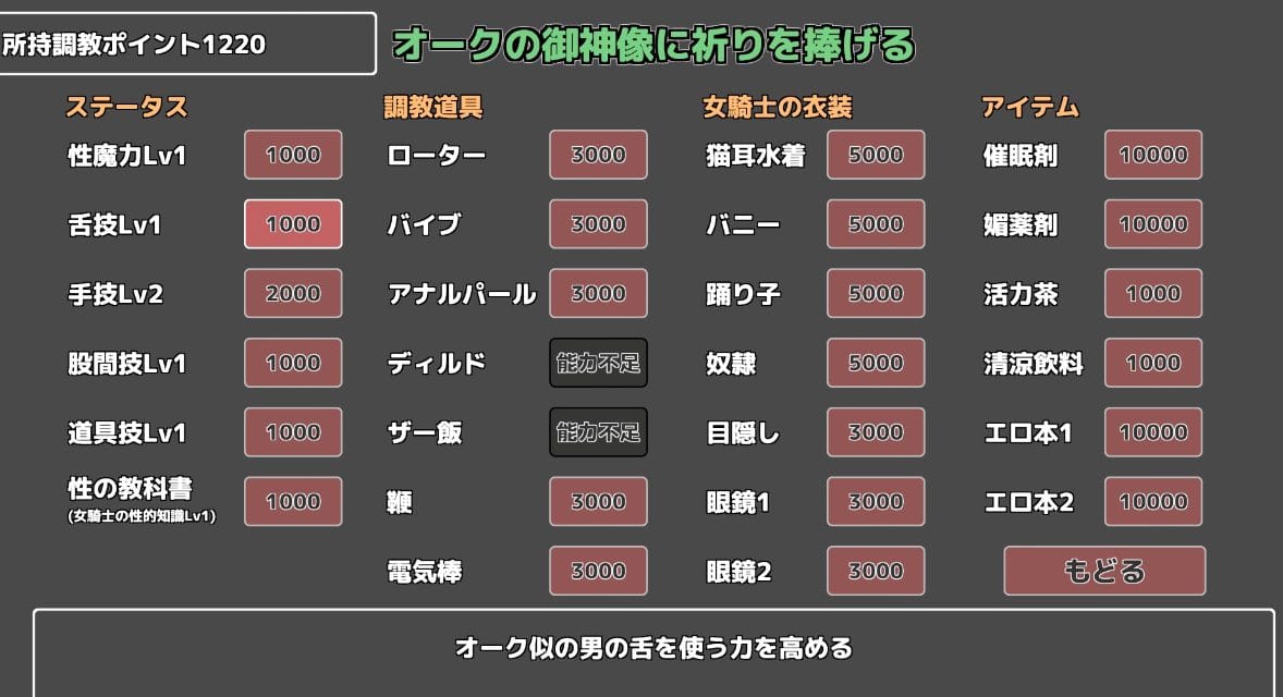 | ③オークの御神像 | 調教ポイントと引き換えにステータスUP、アイテムと交換する |