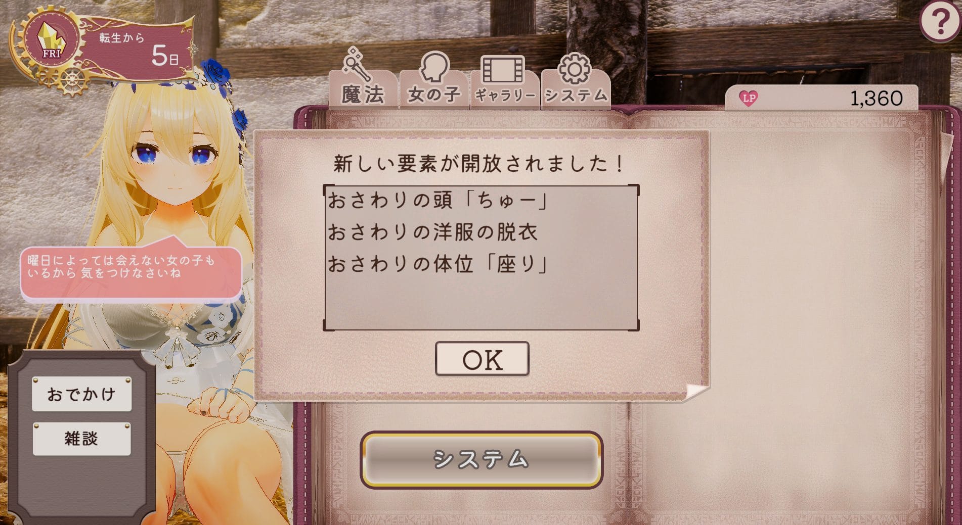 | 暗示魔法 | おさわりの「暗示」を解放する 翌日午前のエルミナの行動が変化する |