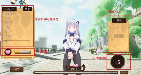 ①おさわり可能状況現在、おさわりできる部位が表示される