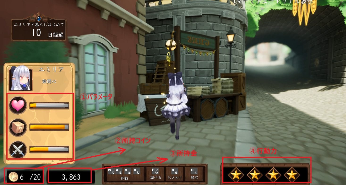 街を歩き回って買い物をしたり、アイテムを見つけたりできるパートです。
