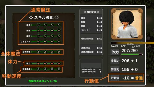 メニュー内にある ”ステータス” を選択する事でプレイヤー強化を行えます。