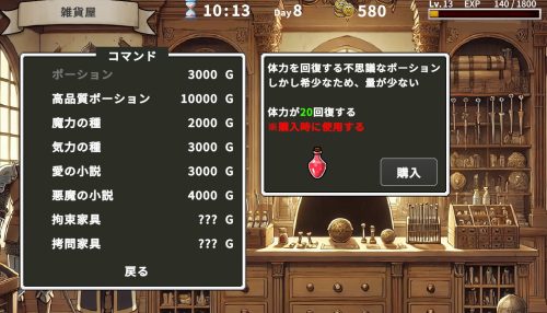 雑貨屋では、回復アイテムやステータスアップアイテムを販売しています。