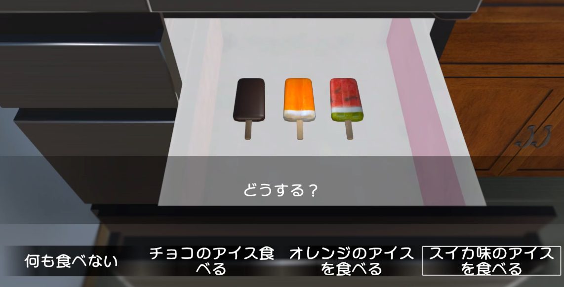 リビングにある書き置きを読んだ後に、冷蔵庫にある3つのアイスを