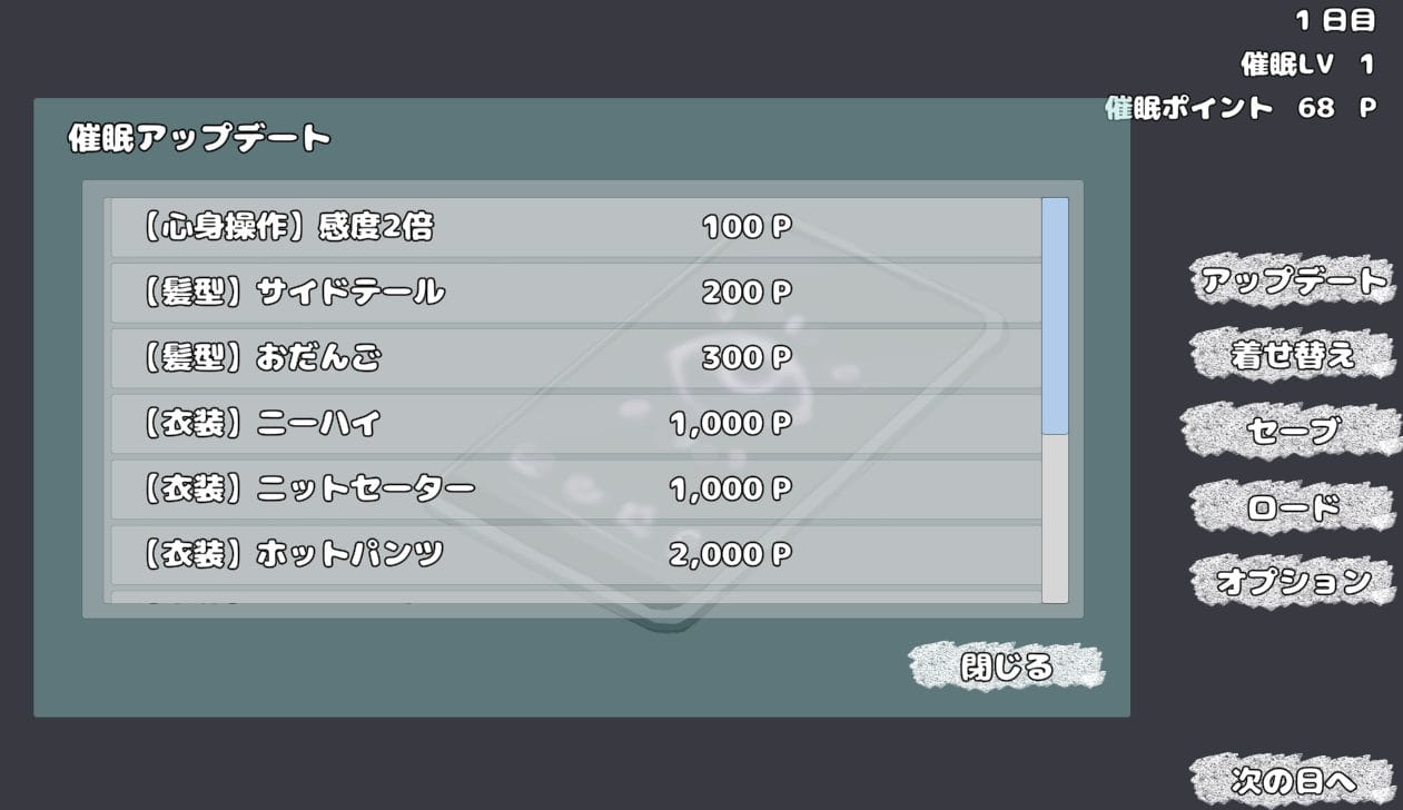 催眠ポイントを消費する事で、衣装などのカスタマイズ出来る要素が