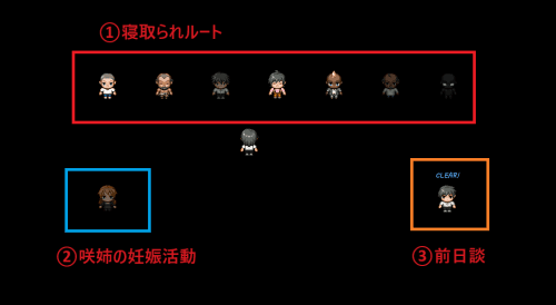 | ①寝取られルート | 7人の対象の男を選択する事で、対象の男に寝取られる 物語が進行していく |