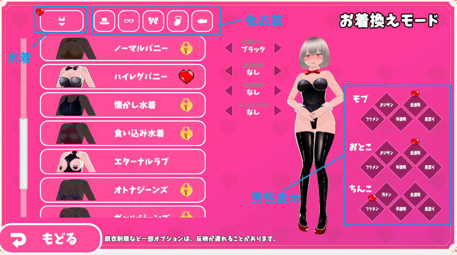 | 男性表示 | 男性表示を半透明、全透明など個別に切り替えられる |