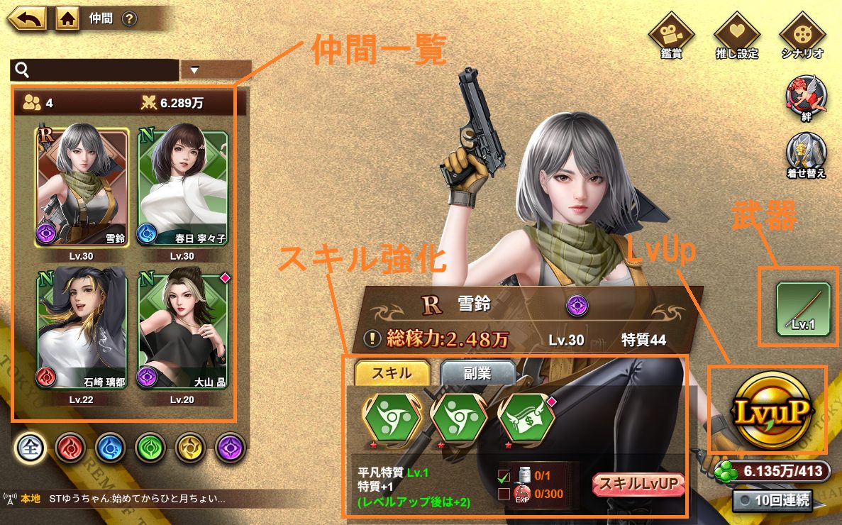 | 育成 | キャラ育成、各種ミッションは無料で行える |