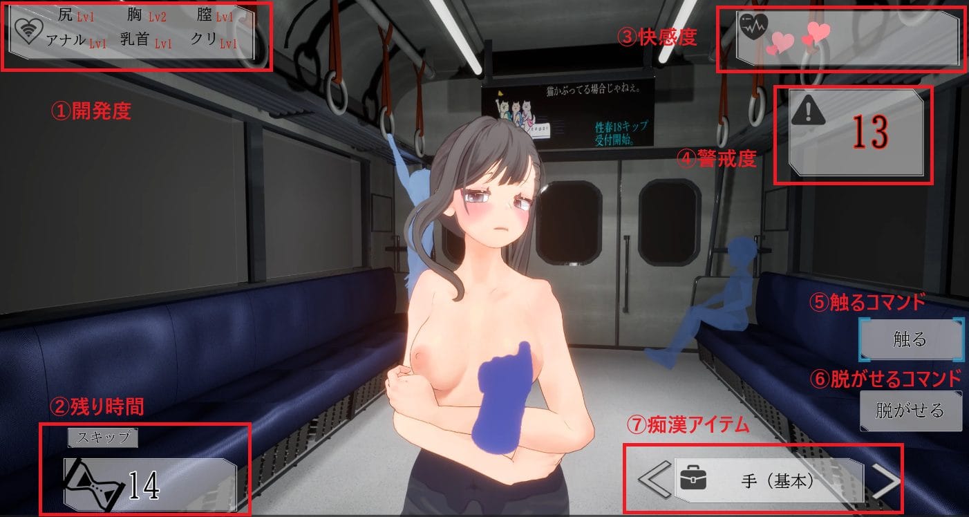 | ①開発度 | ヒロインの部位ごとに痴漢することでレベルが上がる |