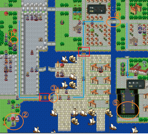 「青線が、軍が行進する順路」「赤色囲みが跳ね橋」「オレンジ丸枠が重要ポイント」