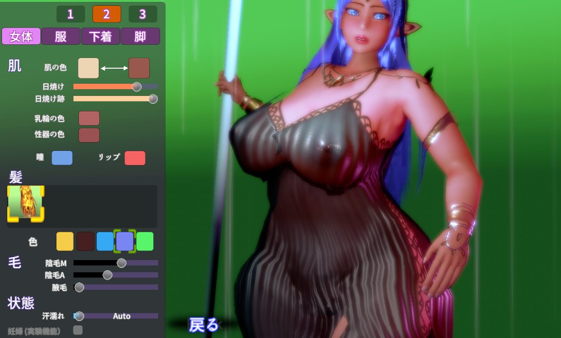 | 髪、乳輪、性器の色 | 髪の毛、乳輪、性器の色、瞳、唇の色も変更可能 陰毛の濃さも変更可能 |